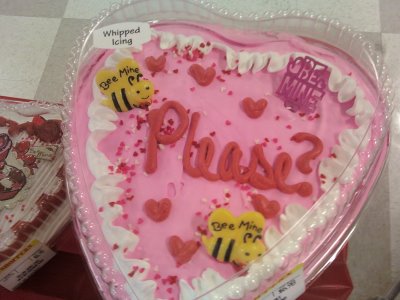 27. What better way to say “Be Mine” than with a heart shaped cake with what appears to be bees, I think.