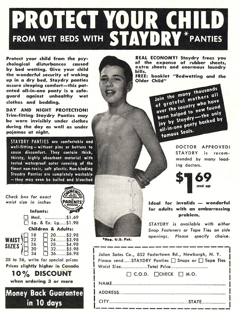 45. Kids keep wetting the bed, well protect them with Stay Dry child diapers.