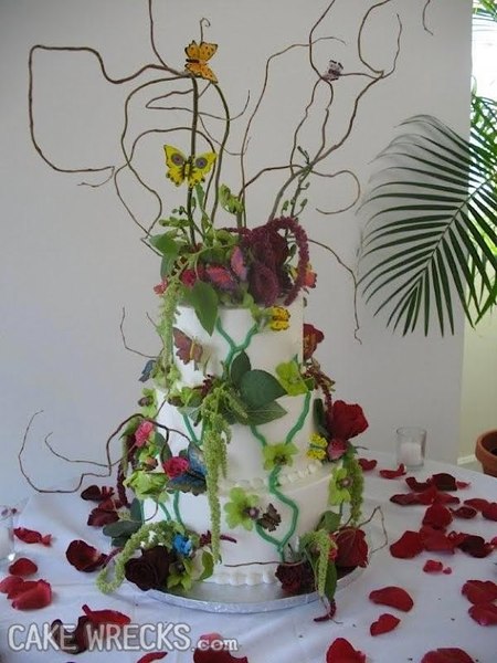 Either that, or the Hershey’s kisses are a stand-in for the flamingo poo droppings. Still, this cake sort of illustrates that this couple has horrible taste.