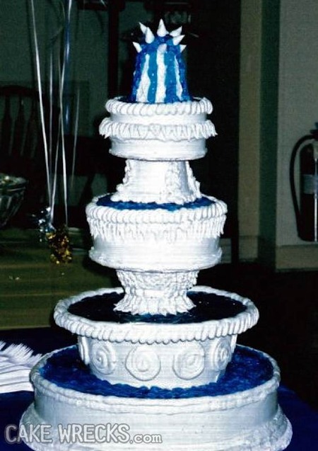 This cake looks more like a little girl’s art project. I swear it seems like the cake is made out of styrofoam and blue electrical tape. I suppose the flowers came from someone’s art set, too.
