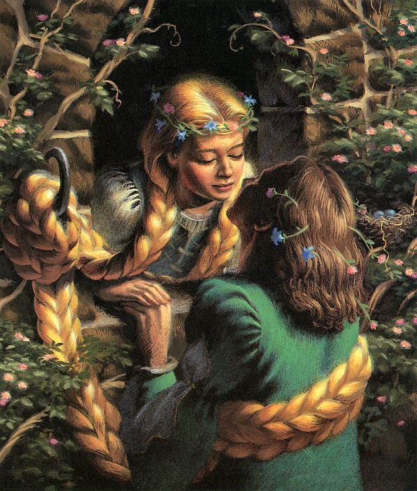 The Original Version: The best known version is by the Brothers Grimm (though probably based on a story called “Petronsinella” by Italian Giambattista Basile though it contains more bawdy language and Mamoidselle La Force’s Persinette which has a fairy instead of a witch) yet this is quite different in which prince doesn’t rescue Rapunzel the first time he’s up there (yet he visits several times) but while they do make plans to elope, they also engage in less family-friendly activities as revealed later when Rapunzel complains to the witch about how tight her dress was getting around the middle (though the Grimms would change this). This would cause the witch to cut off the girl’s hair to lure the prince in and banished her to the desert where she lives as a beggar with no home, no money, and two little mouths to feed after a few months. When the prince came, the witch pushed him off the tower into a bed of thorns which left him blind. They wandered in the desert for some time (during which Rapunzel bore twin boys) before running into each other. Rapunzel would embrace him weeping in which her tears restored the prince’s sight and they all lived happily ever after.