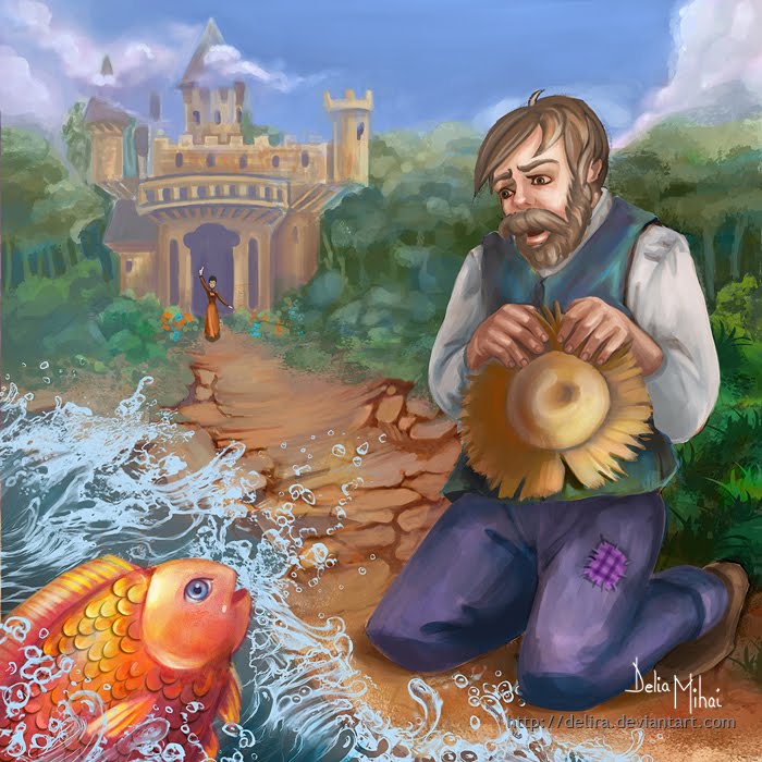 Fisherman about to ask a favor from a fish on behalf of his wife. Notice the castle in the background.