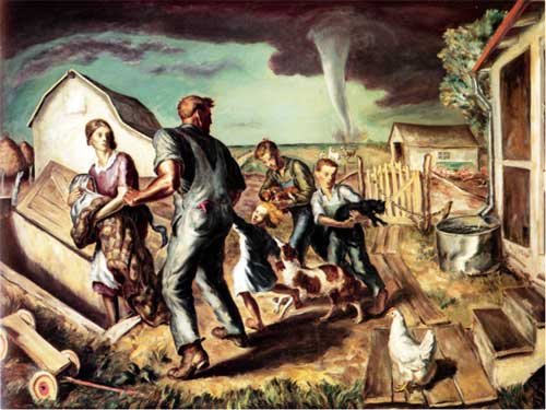 J. Steuart Curry’s 1929 Tornado Over Kansas is basically a depiction of everything we tend to associate Kansas with. I mean Kansas farm families seeking shelter from a tornado during the Great Depression, we’ve heard that before. Of course, if this depicted the Dust Bowl, you probably would’ve thought of Oklahoma. Still, both states were both hit by the Dust Bowl as well as tend to get heavily hit during tornado season.