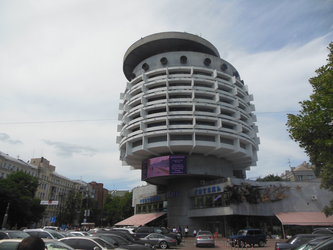 This is an old Soviet style hotel in Kiev, Ukraine. One person writes, “it resembled an immense potato-masher grenade, wider at the top than the bottom.”