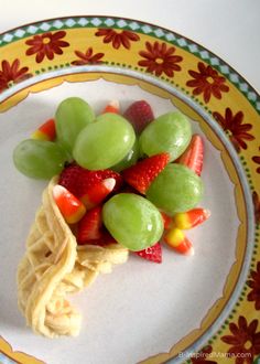 Of course this turkey is made from cheese, pear, strawberries, bananas, and grapes. And it’s walking on waffle pretzels.