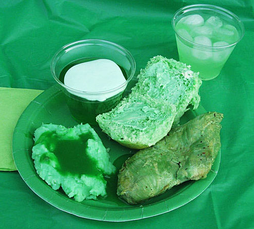 Now I know this is just a normal dinner with chicken, mashed potatoes and gravy, and a bun. Yet, add green food color and it seems quite sickening.
