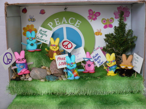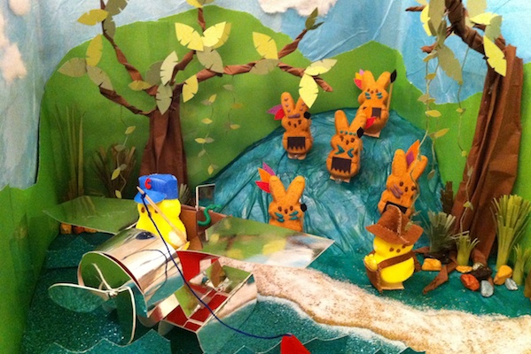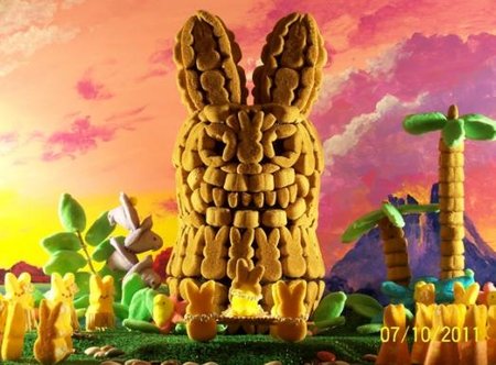 Last year in March, I did a post on peep dioramas since it’s the Easter season and that I think those inedible marshmallow and sugar confections were better enjoyed that way. Since last year, I’ve had 567 views on that post as well as 19 Facebook shares. Now these are rather moderate numbers compared to some of my other posts, holidays or otherwise. But since I enjoyed doing this post so much and think peep dioramas are awesome, I decided to do another edition. I mean as long as they keep making sugary marshmallow products unfit for human consumption we might as well have some fun with them, especially since not all of us are repressed art students who like making dioramas in their spare time. Besides, I need to a break between all this Easter kitsch stuff. So without further adieu, here are some more marshmallow peep dioramas for your Easter sensibilities.