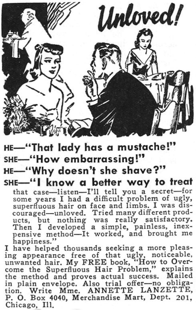 Really? Bad skin? Is it just me or do women in vintage ads seem way too concerned about their looks? I mean having a poor complexion is no excuse for not seeing a guy and locking yourself in your room, which I think is crazy.