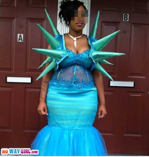 After the Easter celebrations are over, junior and senior high school students all around the country prepare for the major formal high school dance of the year: prom. Prom season is the time of year when American junior and senior high school students spend countless amounts of their parents’ money on overpriced formal dresses and suits, overpriced tickets for an overpriced venue if it’s not the high school gym, overpriced hairstyles, and overpriced transportation. All just so they can attend a dance with mediocre food and music in hopes that they’d somehow get to third base in the backseat of a car without considering the possibilities of an immediate future with child support payments, STD treatments, teen pregnancy, shotgun weddings, or fucking up the rest of their lives. But it’s all portrayed as the fairytale capstone of a high school girl’s experience as well as a rite of passage in the media. Yeah, right. Now I never went to prom while in high school since I had a quiz bowl tournament in Harrisburg my junior year (with my team coming in 7th but my sister erasing all the photos from my parents’ camera. Yet, it was on PCNC). And during my senior year, I had to go to an out of state funeral for a paternal great aunt I’ve only met once in my life (who was the half-sister of a grandfather I’ve never met). Do I regret not going to prom? Hell no. Seriously, my senior year highlights were finishing in the KDKA Hometown HiQ semifinals where my team won $2,000 for the school as well as a Hall of Fame Club lunch I attended with my father, finishing second in a journalist writing contest winning $25 for myself, attending a friend’s Halloween party, and going on a trip to Disney World with my high school marching band. However, my sister went to her school prom both years and was a member of homecoming court as a senior. And so have many other high school students. Now the average high school promgoer spends an average of about $900 on prom according to the statistics on while I was in high school. So I’m sure that a lot of businesses make a killing off it. But what gets a lot of attention at prom are the overpriced formal dresses which are sometimes designed by straight male perverts and worn by 20 year old models in magazines. Now I can go on with all the pretty prom dresses out there. But you’d probably be bored to tears so I’ll show you some of the prom fashion disasters. Now I have it as Not Safe for Work because some might images might disturb the parents and that I don’t want teenagers to look at it. So without further adieu, here are some of prom’s most epic fashion catastrophes you can’t unsee.
