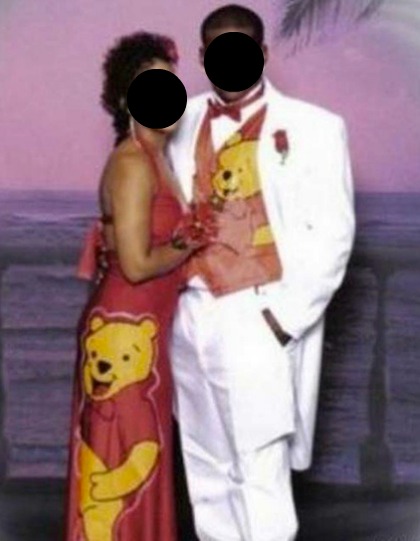 Good News: Looks like these people didn't spend a lot of money on their prom outfits. Bad News: Their clothes were made from the same material. Very Bad News: The fabric is ugly.