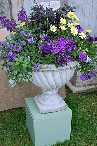 From the Images: “Waterfall blue lobelia – No other blue flower can match the intensity of Waterfall Blue lobelia, a perfect floral imitation of water flowing from the pot. Riverdene Gold Mexican Heather gives a lime green color around the container, and Rustic Orange coleus in behind looks good with the heather and the intense blue of the lobelia.” Man, and I thought I said too much sometimes.