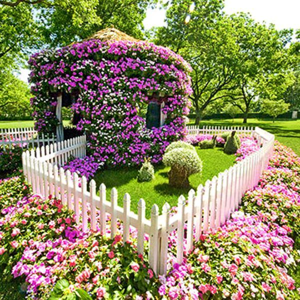Now this is a quaint scene with a little house, clothes line, swing, and path. But I'm sure the flowers are all regular sized.