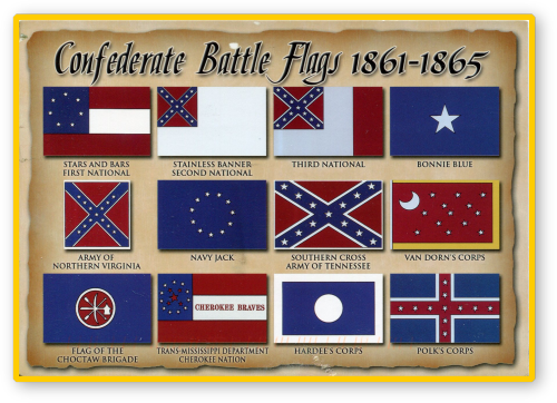 These are the official and military flags used by the Confederacy during the American Civil War. Though never used in any official capacity, the Confederate Battle Flag was used as an unofficial emblem of the Confederacy. This was because it was a very recognizable design from long distances.