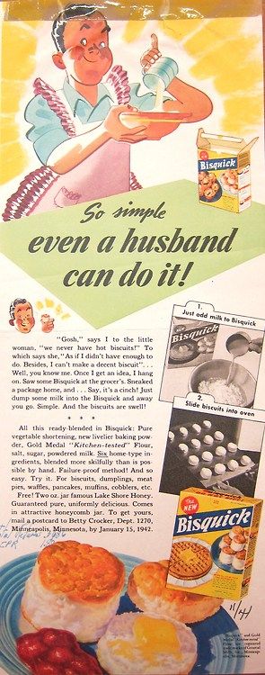 Yeah, a guy needs Bisquick to make his own biscuits. Of course, why these people think men can’t cook for themselves, I have no idea. I’m sure some husbands could cook at the time. Not all men have to be helpless in the kitchen.
