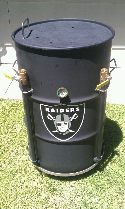 - Grill burgers and hotdogs for tailgating with this Oakland Raiders drum smoker.