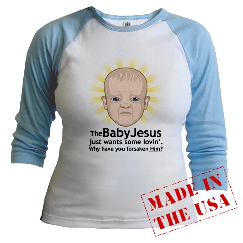 Is is just me or do I find baby Jesus on this shirt unintentionally creepy? Seriously, I think this is pretty tasteless on divine levels.