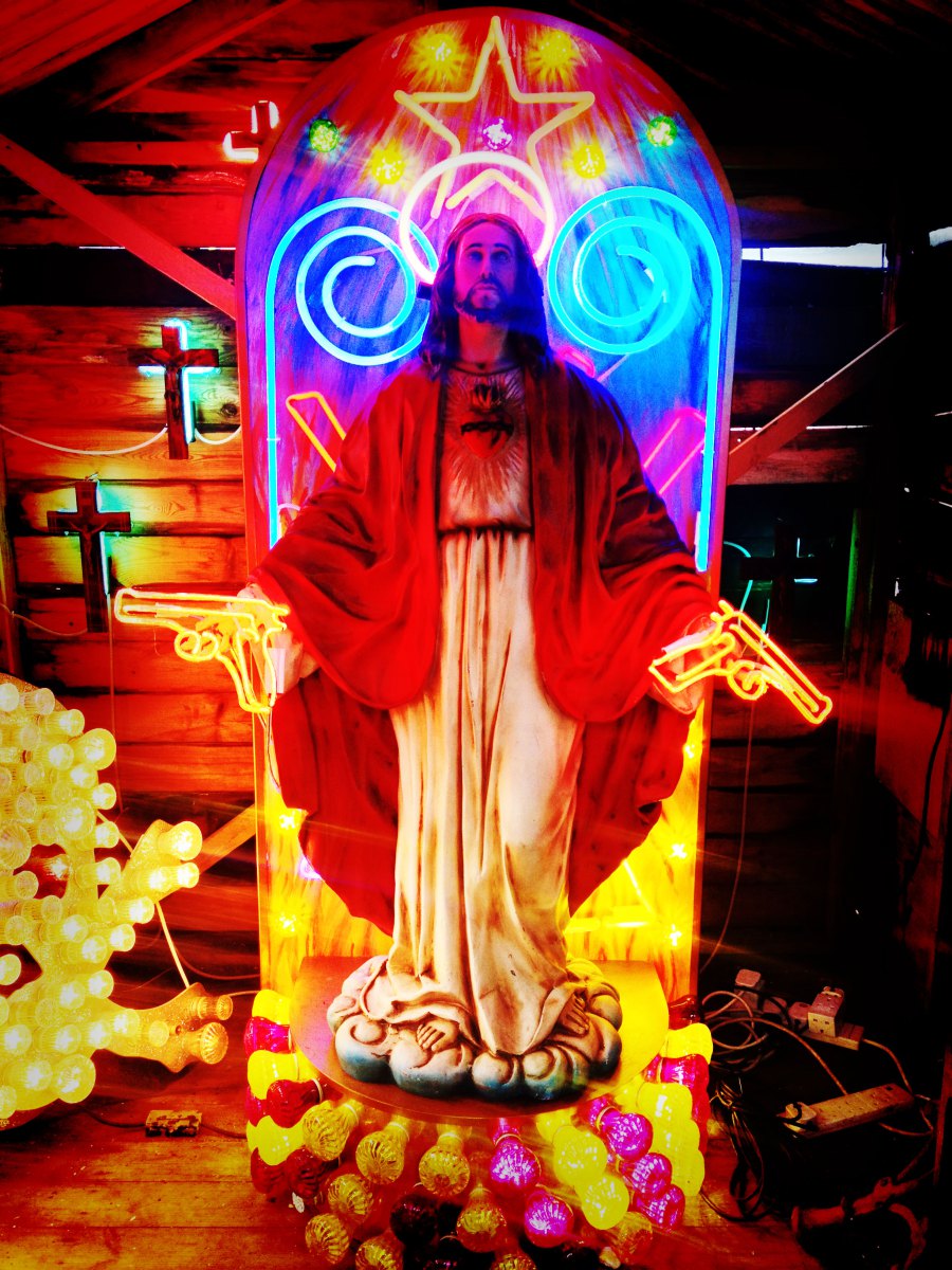 12. Show your love for Jesus and the American way with this neon and gun Jesus statue.