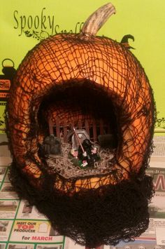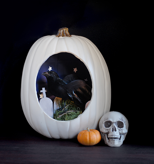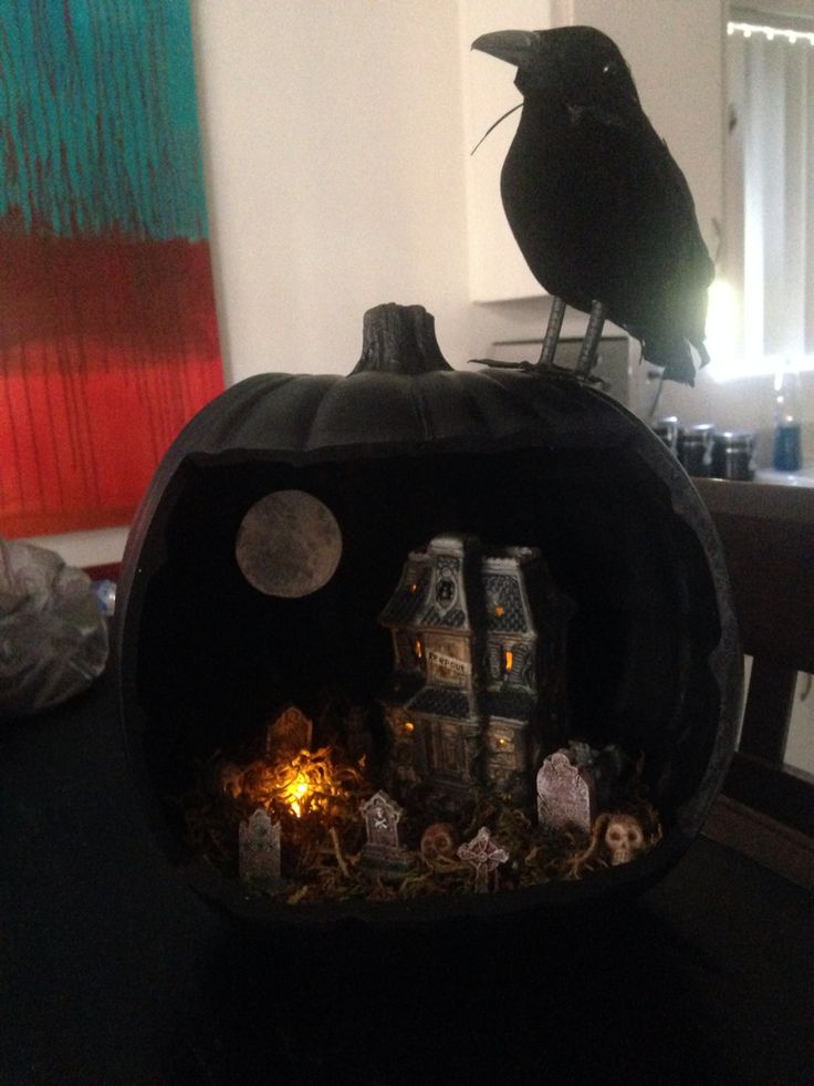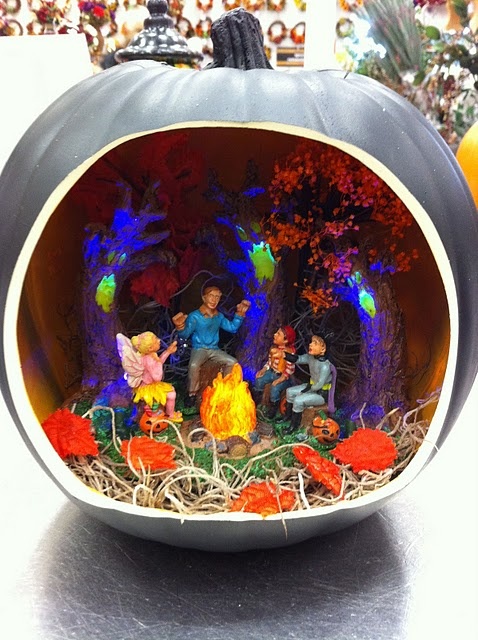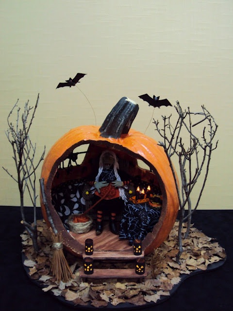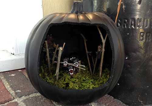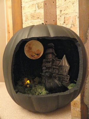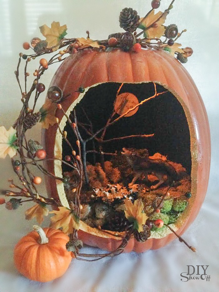 Now this is quite rustic for a pumpkin diorama. But still, really like the owl in its hole. Not very scary but very fitting for fall.