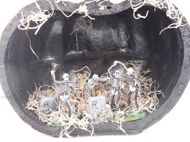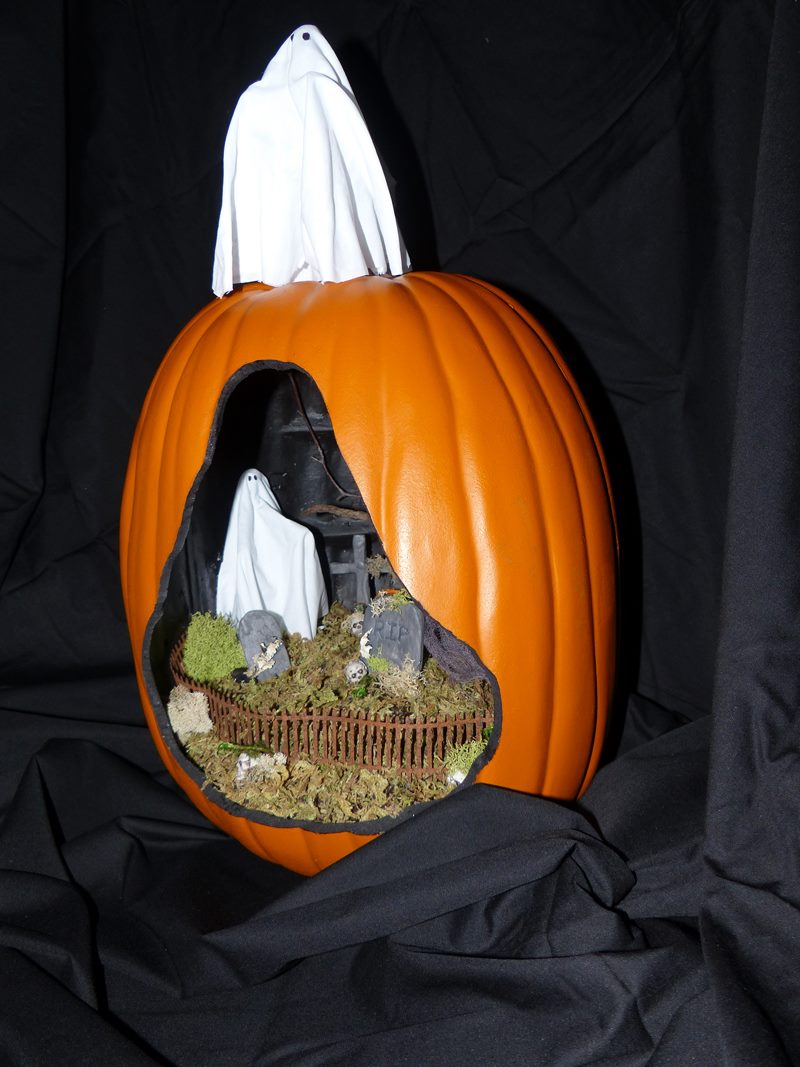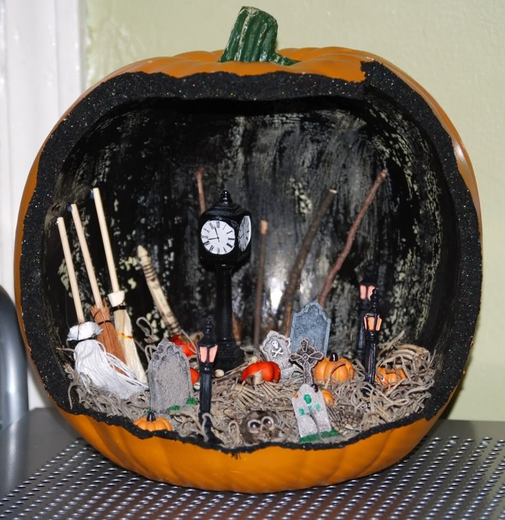 Most of you might know that Halloween is the time of year when people carve pumpkins into jack o’ lanterns and other carvings. However, for those who might be bored with the idea of carving pumpkins, you might want to consider an alternative. And while doing my post on Halloween crafts, I found just the thing: pumpkin dioramas. This just entails cutting a pumpkin from the side, taking any stuff out, and decorating the inside however you please. Or you can just use a foam one wherever they sell them. And while it’s not nearly as popular as the Easter peep dioramas, you still have some of these on Pinterest. You can also see quite a few tutorials on the subject as well if you’re interested. Now many pumpkin dioramas consist of Halloween scenes like graveyards, haunted houses, pumpkin patches, and the like. And like jack o’lanterns, they’re usually lit from the inside, too. But if you’re a repressed art major or someone looking for a different kind of crafting, then be my guest. So without further adieu, here are some spooky pumpkin dioramas.