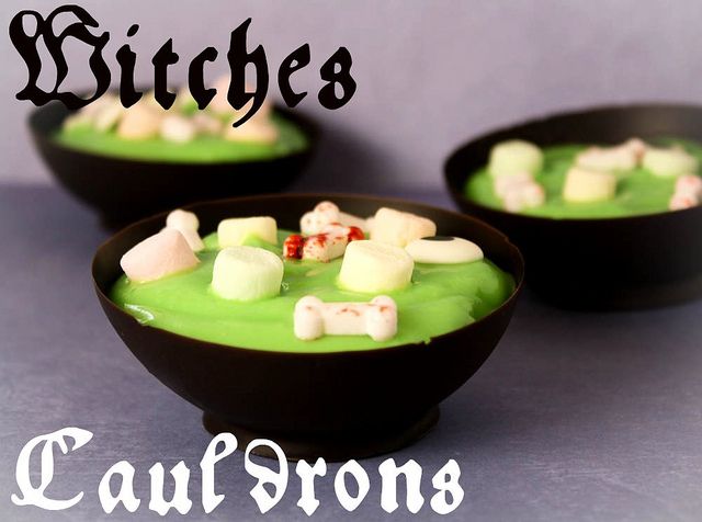 In this, the cauldron is made from chocolate. And the pudding is green with sprinkles on it. Still, I think this might be store bought from the looks of it.
