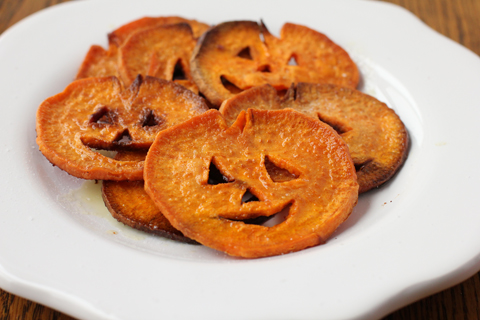 Of course, since sweet potatoes are orange on the outside, you have to make jack o’lanterns out of the slices. Still, quite cute and clever.