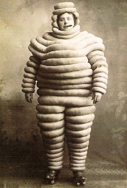 And he’s smoking a cigar, lovely. Now Michelin was founded in 1889 and the Michelin Man has been around since 1898. So it’s probably possible that such Michelin Man costume existed at the time.