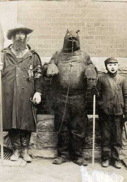 19. Group costumes were also popular as well. This one is of a bearkeeper, bear, and hunter.