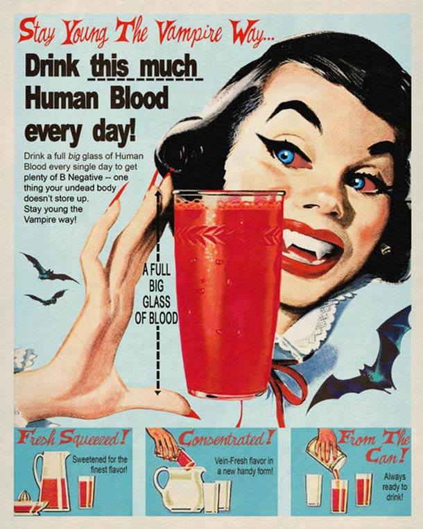 Of course, with a recommendation like that, a vampire might need to rob a blood bank once in awhile. Still, it’s not real blood. Just juice. But yeah, kind of creepy.