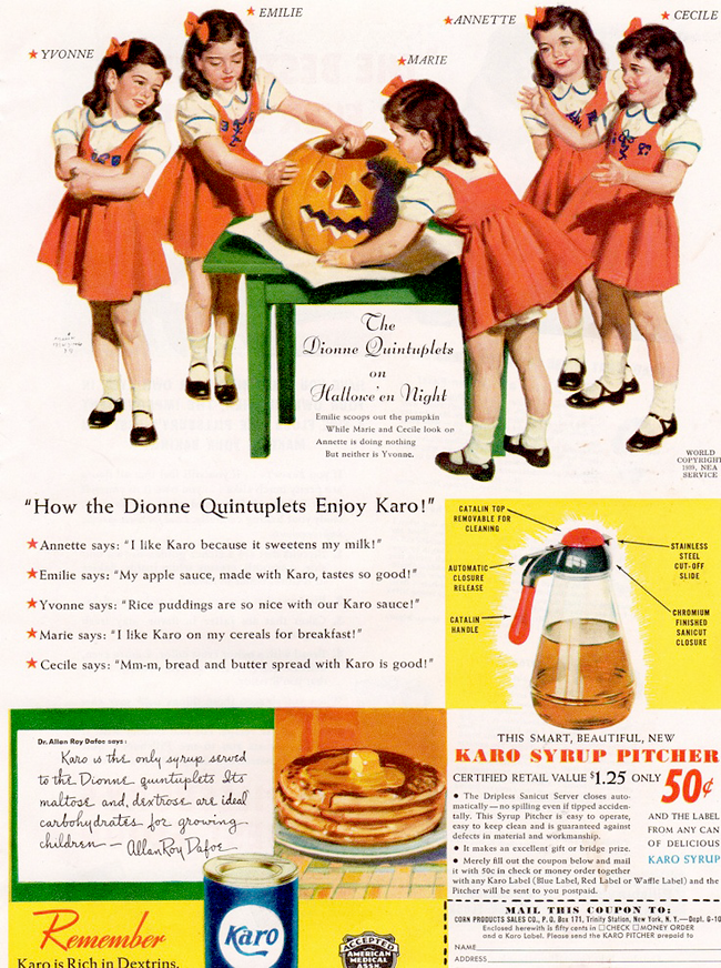 54. Nothing makes better syrup for Halloween breakfast for the Dionne quintuplets than Karo.