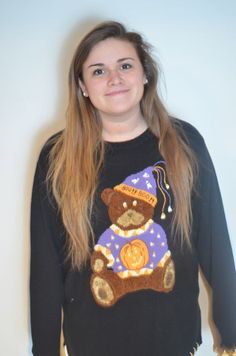 38. Nothing makes a great Halloween sweater than a candy corn eyed teddy bear in a costume.