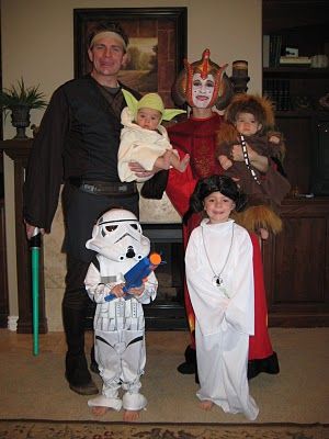 Let’s see, the parents are a Stormtrooper and Princess Leia. The kids are Darth Vader, Yoda, and R2-D2. Still, the tutu is so cute.