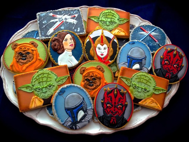 Now these cookies look professionally made. Yet, the consist of Yoda, an X-Wing, Padme Amidala, Darth Maul, Boba Fett, lightsaber duel at Cloud City, and Princess Leia.