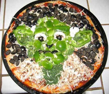 Toppings of green bell peppers, broccoli, mushrooms, and olives it has. So healthy for a Jedi master, it is.