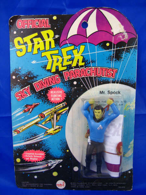 From The Robot’s Voice: “For those days when a Vulcan wants to jump from the Enterprise through a planet’s atmosphere, most certainly burning himself to a crisp, assuming the vacuum of space doesn’t make him freeze and implode first. Drugstore toy maker Ahi extended this line of parachuting figures to characters from Planet of the Apes too, which is equally baffling. Although if the PotA apes had parachute technology, they’d be even more deadly, that’s for sure.”