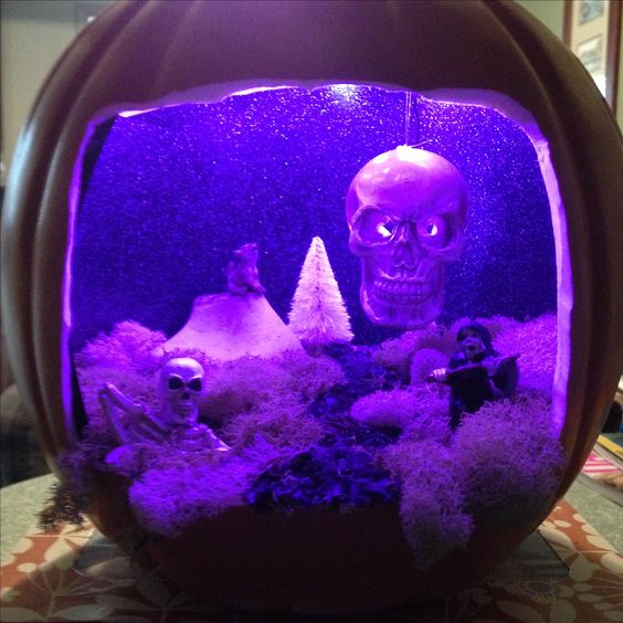 25665a7eff1f678c412b26d5f097afca Published October 26, 2016 at 564 × 564 in The Spooky World of Halloween Pumpkin Dioramas (Second Edition) ← Previous Next → Now this one is quite menacing. Really like how the one skeleton rises out of the ground and the white trees. That kid will surely need therapy.