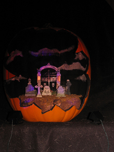 cemetery-pumpkin-main Published October 26, 2016 at 225 × 300 in The Spooky World of Halloween Pumpkin Dioramas (Second Edition) ← Previous Next → Love how they painted the clouds in this one. Also like the large gate. Really eerie.
