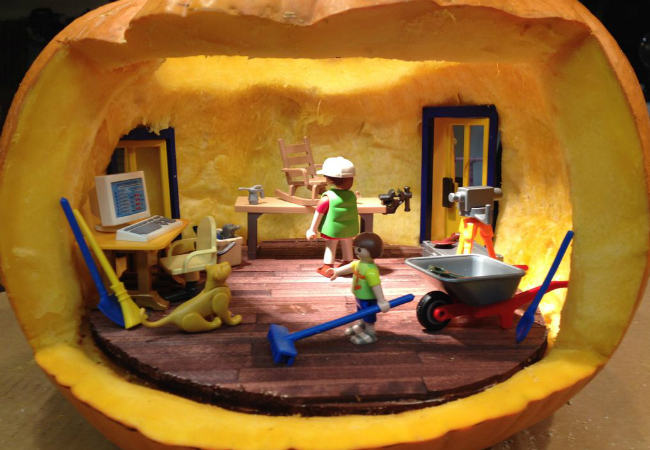 pumpkin_4 Published October 26, 2016 at 650 × 450 in The Spooky World of Halloween Pumpkin Dioramas (Second Edition) ← Previous Next → This one uses Playmobil figures. Must’ve been made for a kid so it would be less scary.