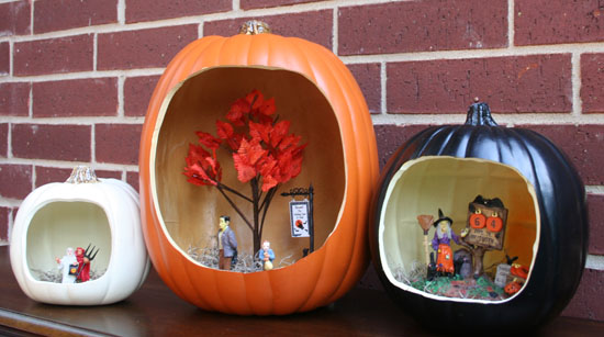 pumpkins3 Published October 26, 2016 at 550 × 307 in The Spooky World of Halloween Pumpkin Dioramas (Second Edition) ← Previous Next → These seem to have a more vintage look to them. Two have trick or treaters. One has a witch.