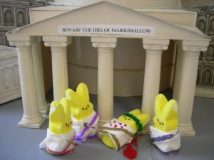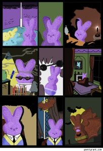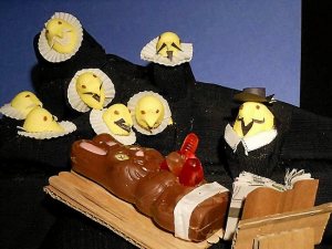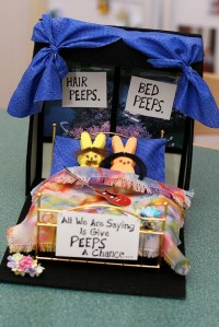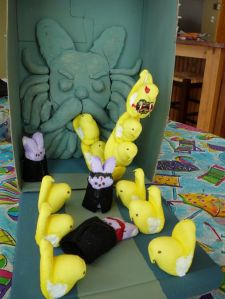 Of course, nothing could say Easter on my blog than another post on peep dioramas. As you probably know that peeps are these sugar coated marshmallows in the forms of bunnies and chicks that are unfit for human consumption. Though that doesn’t stop people from trying to pass them off as Easter candy. However, there is a better way to use these inedible marshmallows of cuteness for this Easter season. And that’s where peep dioramas come in. Over the years I’ve done posts of these cuteness scenes mostly mocking pop culture and concepts of every day life. And while kids make them, you can say a lot of these I show aren’t necessarily G-Rated. Though there are plenty of contests, with the most notable being from the Washington Post. But a lot of them are clever while I certainly enjoy them. So as long as there’s Easter, my viewers will have to put up with them. Thus, for your reading pleasure, I give you another assortment of peep dioramas.