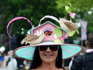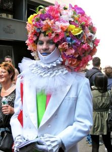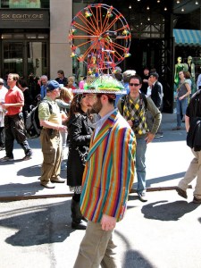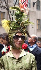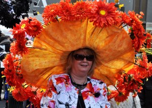 This woman’s wearing an Easter bonnet consisting of a stack of pillows and decorations. Yes, it’s outrageous and I’m not sure how she keeps her head up.