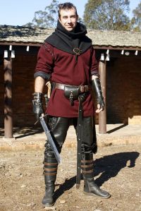 He has a sword and his tunic with leather pants and boots. Simple yet effective.