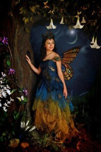She has a peacock feather crown with butterfly wings. Love the feathers.