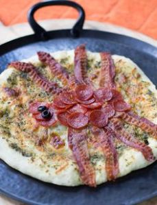 The spider consists of pepperoni and bacon. Also, contains olive eyes.