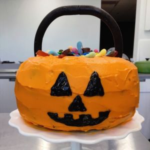 Well, it’s a chocolate jack-o-lantern cake. The facial attributes are lined with white chocolate chips.