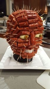 It’s a pumpkin cheeseball covered in Doritos and olives. Has a pickle for a stem.