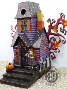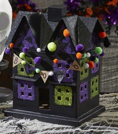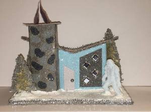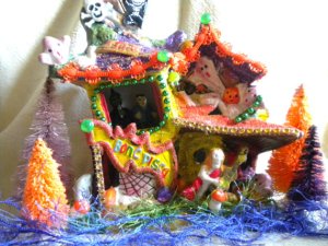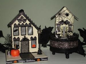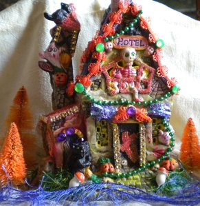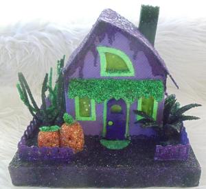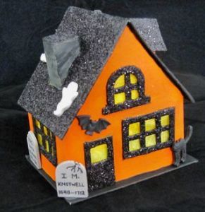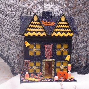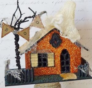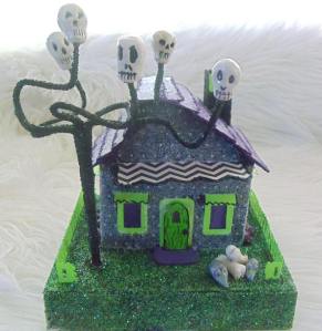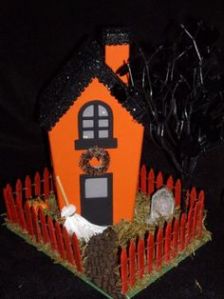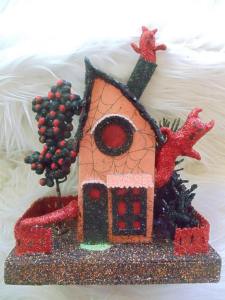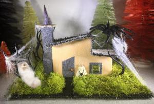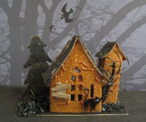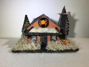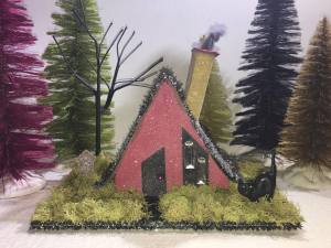 This one has a roof trimmed with tinsel and a black tree on its side. A bat is on the front door.