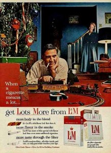Yet, he likes his smokes as he plays with his toy trains. Meanwhile his wife smiles upon him just before she has to scramble into the kitchen to make a dish for Christmas dinner at his parents. But don’t worry, tobacco kills 1/3 of its users anyway.