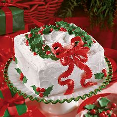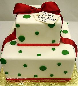 Ironically this is a present cake. Not sure what I think about the green spots. But I like the red ribbon.