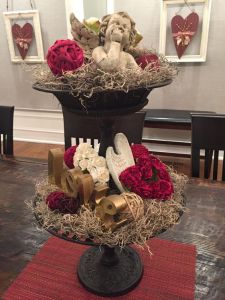 This bouquet is on a tiered serving tree. And it’s decorated with heart ornaments. So pretty.