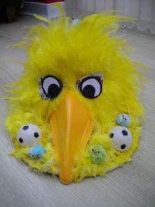 This one has a chick on top with eggs on the brim. And yes, the chick is a plushie.